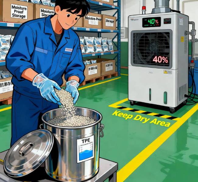 Οι πρώτες ύλες TPE πρέπει να αποθηκεύονται μακριά από συνθήκες υγρασίας. Συνιστάται η διατήρηση των υλικών σε ξηρούς, καλά αεριζόμενους χώρους. Περιβάλλοντα υψηλής υγρασίας μπορεί να προκαλέσουν απορρόφηση υγρασίας, επηρεάζοντας αρνητικά την επακόλουθη απόδοση επεξεργασίας και την ποιότητα του τελικού προϊόντος.